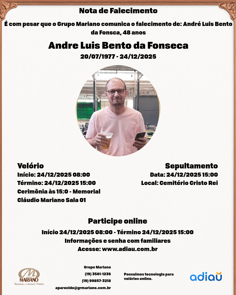 A Funerária Grupo Mariano (Santa Catarina) com profundo pesar, informa o falecimento do Sr Andre Luis Bento da Fonseca, (Bento) 48 anos, era casado com a Sra Suelen Rigon Bento da Fonseca e deixa um filho de nome Matteo, demais familiares e amigos.