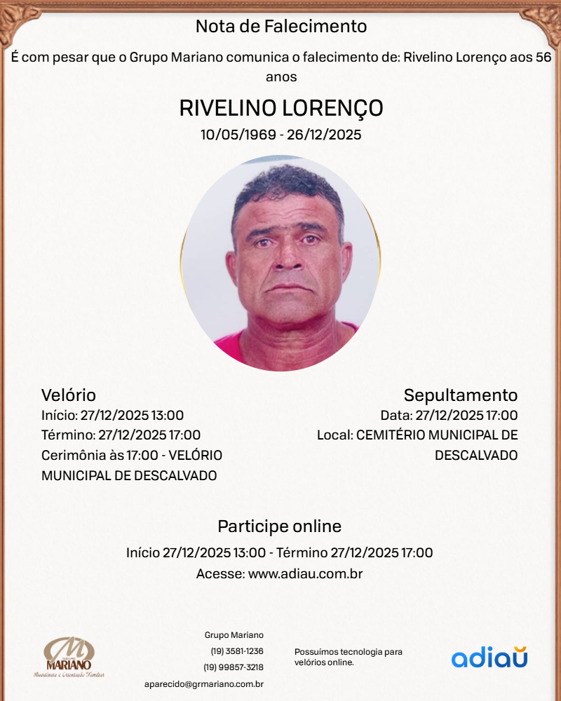 A Funerária Grupo Mariano ( Nossa Sra. do Belém) com profundo pesar, informa o falecimento do Sr. Rivelino Lorenço aos 56 anos, deixa esposa Marinete Fernandes, mãe, filhos, nora genro sobrinhos, netos, bisnetos demais parentes e amigos.