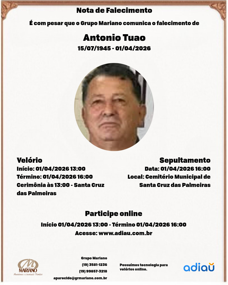 A Funerária Grupo Mariano (Santa Cruz), com profundo pesar, informa o falecimento do Sr. Antonio Tuao, aos 80 anos.