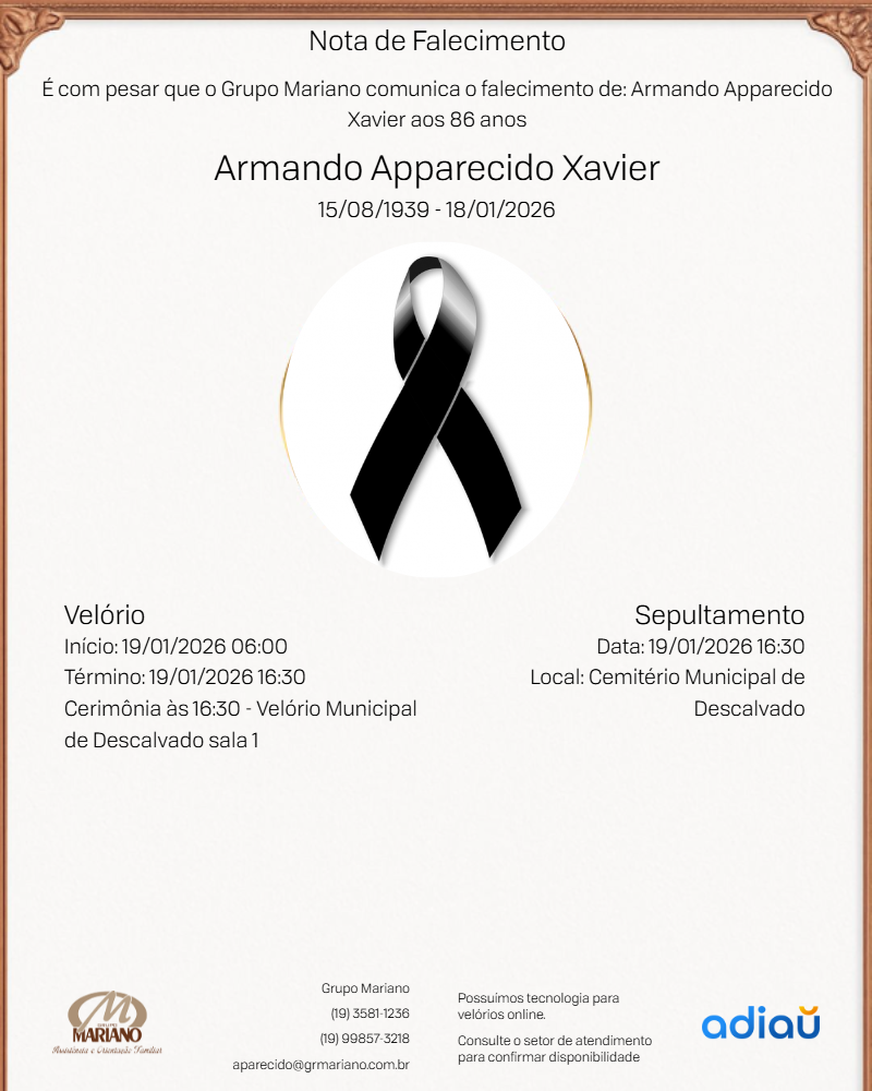 O sr Armando Apparecido Xavier, será velado no dia 19/01/2026 as 06:00 no Velorio Municipal á rua Cel Manoel Leme 50 Centro Descalvado