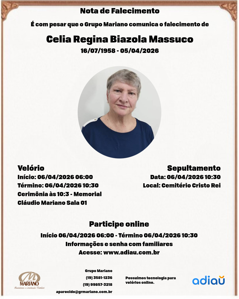 A Funerária Grupo Mariano (Santa Catarina) com profundo pesar, informa o falecimento da Sra Celia Regina Biazola Massuco, 67 anos, solteira, deixa a filha Ana Cristina, netas, demais familiares e amigos.