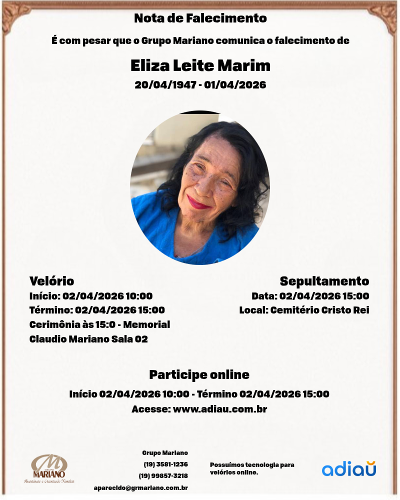 A Funerária Grupo Mariano (Santa Catarina) com profundo pesar, informa o falecimento da Sra Eliza Leite Marim, (Lica) 78 anos, casada com o Sr Luiz Marim, deixa as filhas, Cláudia, Claudiane e Claudimare, demais familiares e amigos.