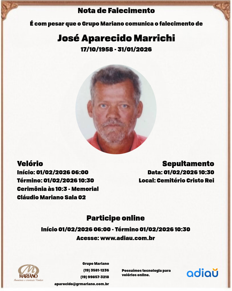 A Funerária Grupo Mariano (Santa Catarina) com profundo pesar, informa o falecimento do  Sr JoséAparecido Marrichi, aos 67 anos, solteiro, deixa uma filha, “Patricia”, demais familiares e amigos.