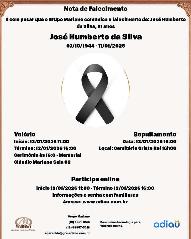 O Sr José Humberto será velado hoje, 12/01/2026, na sala 02 do Velório Santa Catarina – Memorial Claudio Mariano, à Rua Coronel João Procópio, 775 Centro – Porto Ferreira.