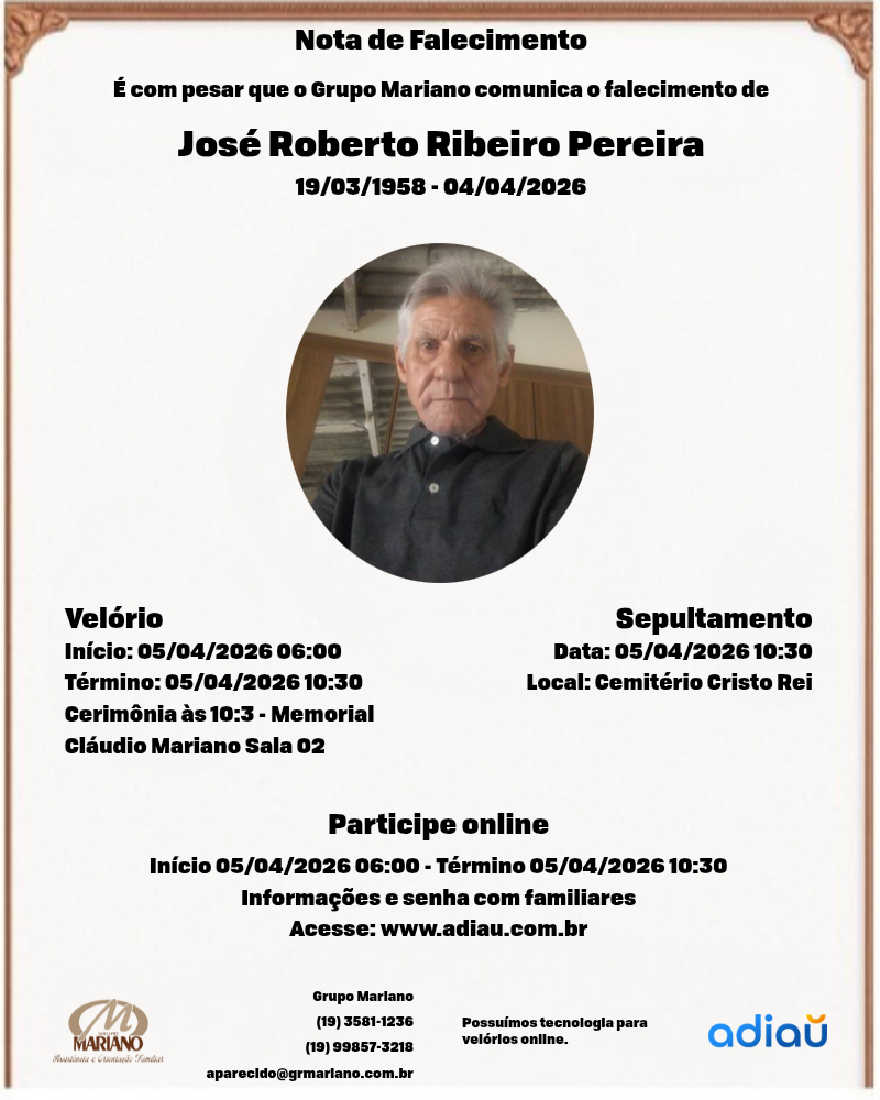 O Sr. José  Roberto será velado amanhã, 05/04//2026 na sala 02 do Velório Santa Catarina – Memorial Claudio Mariano, à Rua Coronel João Procópio, 775 Centro – Porto Ferreira.