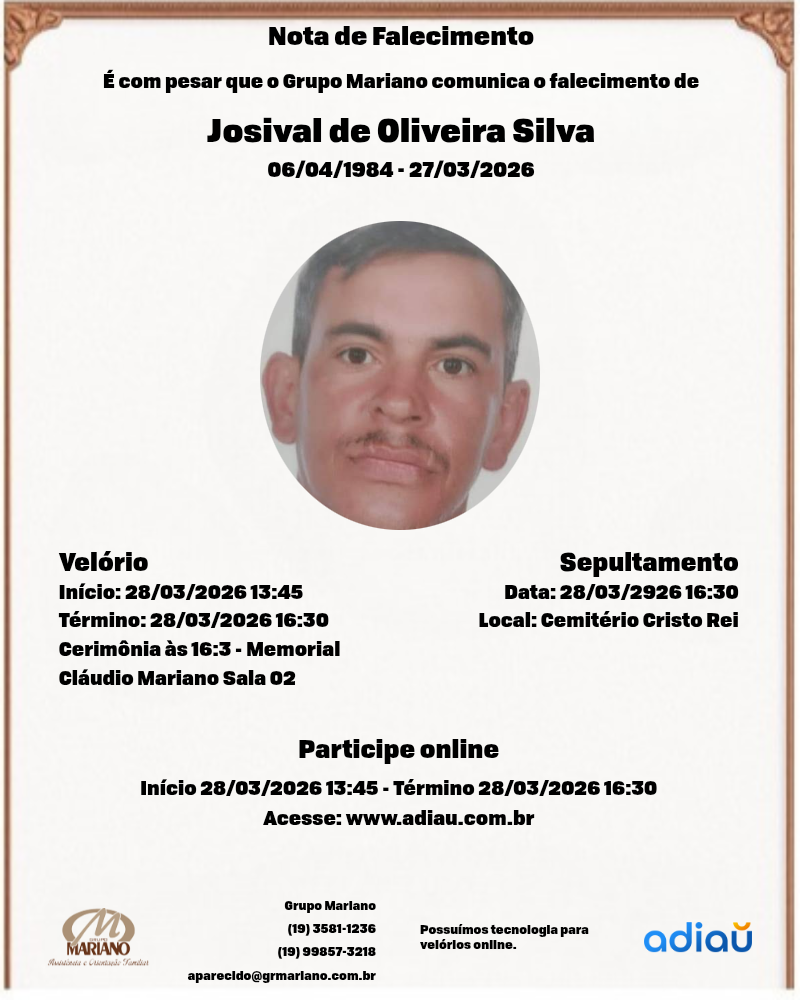 A Funerária Grupo Mariano (Santa Catarina) com profundo pesar, informa o falecimento de Josival de Oliveira Silva, (Magrelo) 41 anos, solteiro, deixa os filhos kauã e Kaiane, demais familiares e amigos.