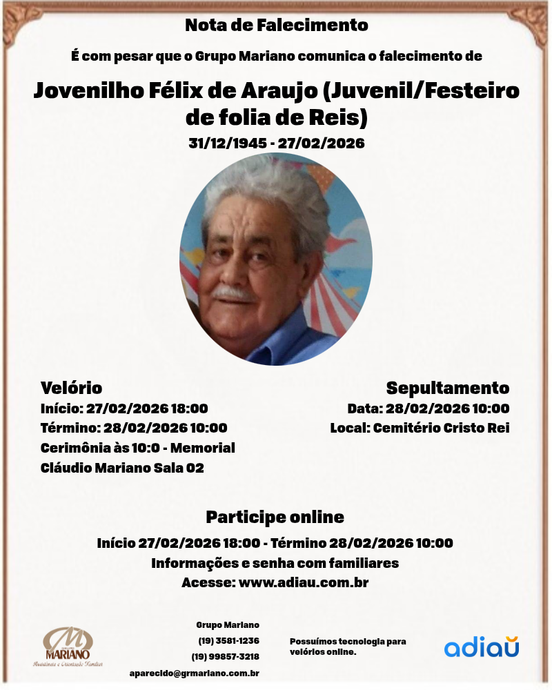 A Funerária Grupo Mariano (Santa Catarina) com profundo pesar, informa o falecimento de Jovenilho Félix de Araujo ( Juvenil/Festeiro de folia de Reis), 80 anos, casado com a Sra Victa Jerônimo Alves de Araujo, deixa os filhos: Elaine, Alessandra, Adenilson e Alessandro, demais familiares e amigos.