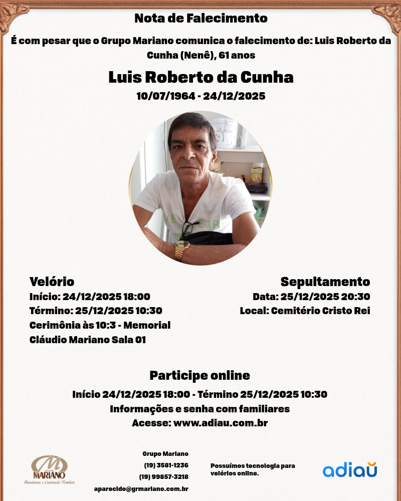 A Funerária Grupo Mariano (Santa Catarina) com profundo pesar, informa o falecimento do Sr Luis Roberto da Cunha, (Nenê) 61 anos, era casado com a Sra Edma de Fátima Correa da Cunha e deixa um filho de nome Márcio, demais familiares e amigos.