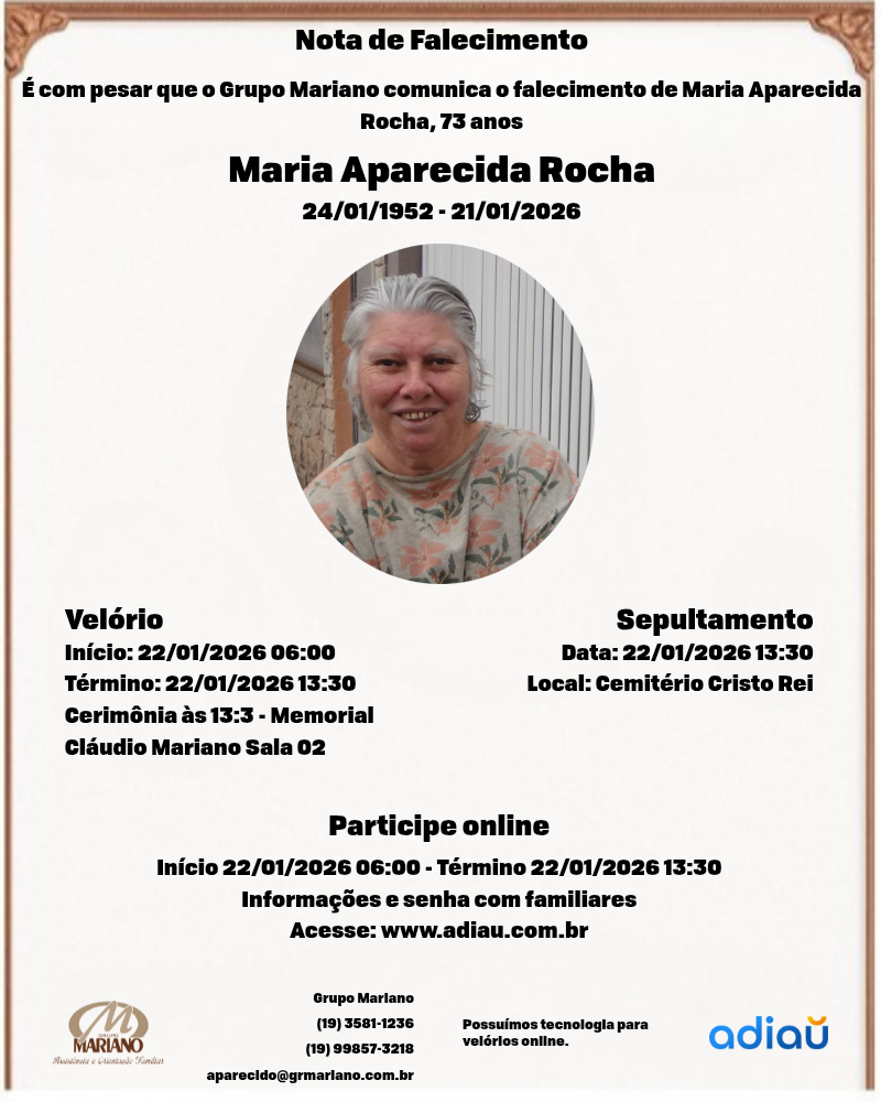 A Sra Maria Aparecida será velada amanhã 22/01/2026, na sala 02 do Velório Santa Catarina – Memorial Claudio Mariano, à Rua Coronel João Procópio, 775 Centro – Porto Ferreira.