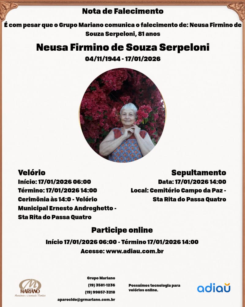 A Funerária Grupo Mariano (Organização de Luto Santa Rita) com profundo pesar, informa o falecimento da Sra Neusa Firmino de Souza Serpeloni, 81 anos, viúva, deixa os filhos: Marly, Marco e Maria Ligia, demais familiares e amigos.