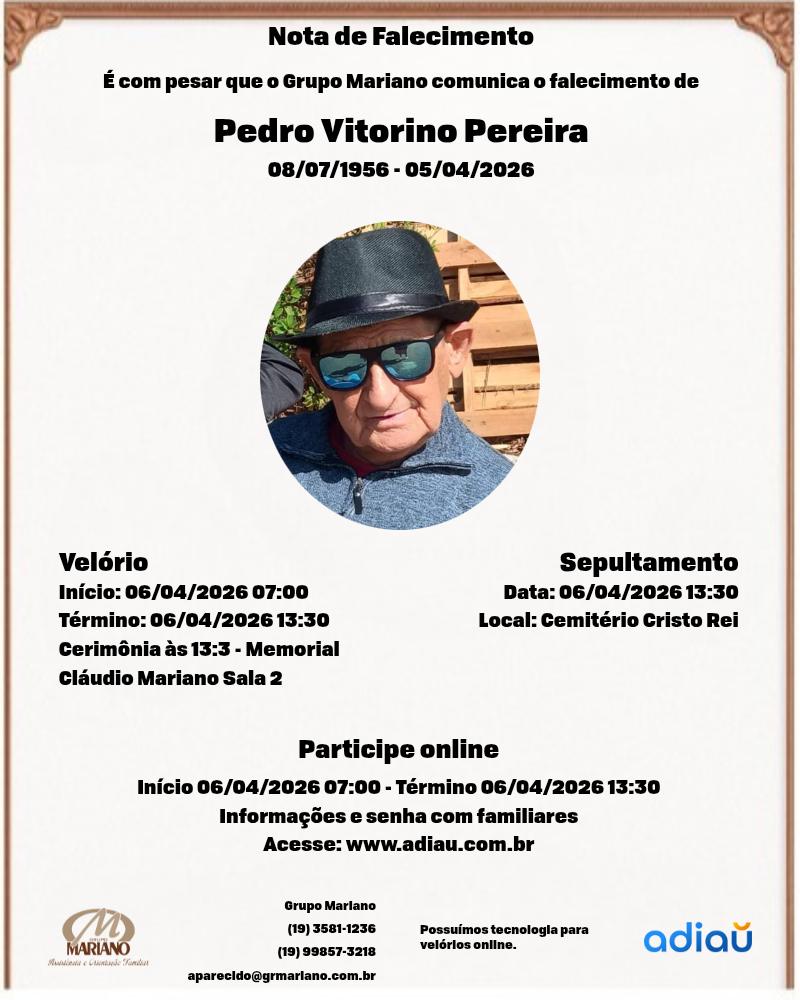 O Sr. Pedro será velado hoje, 06/04//2026 na sala 02 do Velório Santa Catarina – Memorial Claudio Mariano, à Rua Coronel João Procópio, 775 Centro – Porto Ferreira.