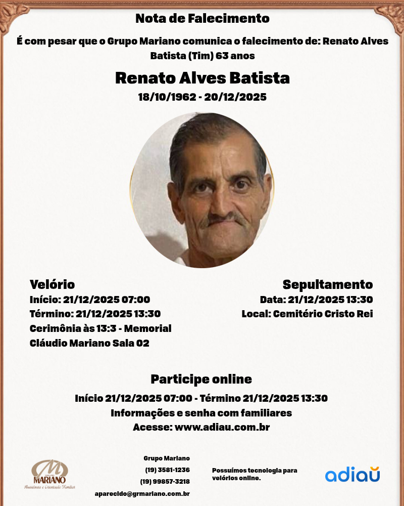 A Funerária Grupo Mariano (Santa Catarina) com profundo pesar, informa o falecimento do Sr Renato Alves Batista (Tim), 63 anos, era casado com a Sra Gislaine da Silva e deixa os filhos: Leandro, Luciano, Alexandre, Giovani e Letícia, demais familiares e amigos.