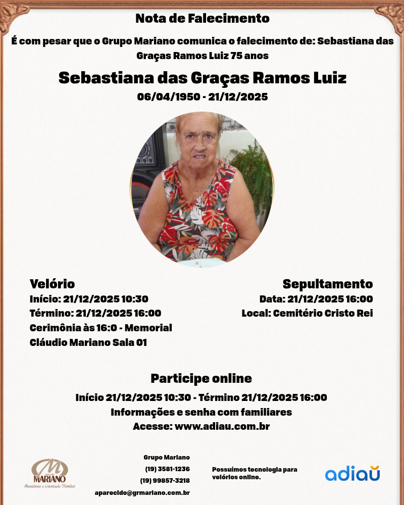 A Funerária Grupo Mariano (Santa Catarina) com profundo pesar, informa o falecimento da Sra. Sebastiana das Graças Ramos Luiz aos 75 anos, deixa os filhos: Vera Lúcia, Valdeli, Lucinéia, Claudinéia, Carlos, Lurdes, Donizeti, Flávia, Luciana, Adriana, netos, bisnetos, demais familiares e amigos.