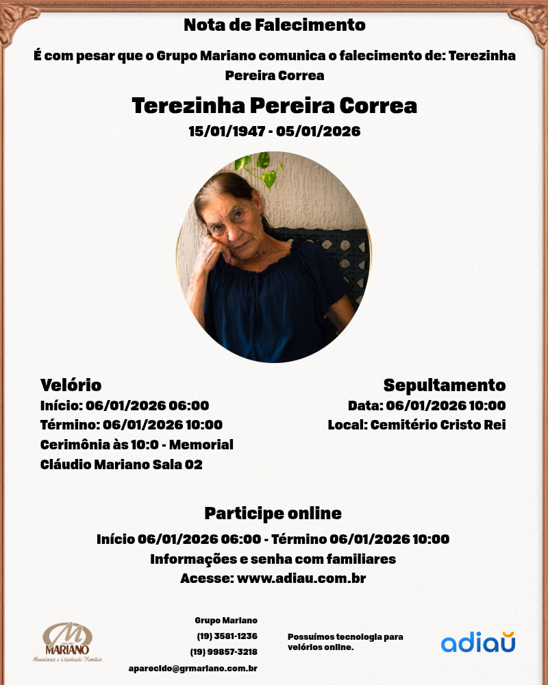 A Sra Terezinha será velada hoje 06.01.2026, na sala 02 do Velório Santa Catarina – Memorial Claudio Mariano, à Rua Coronel João Procópio, 775 Centro – Porto Ferreira.