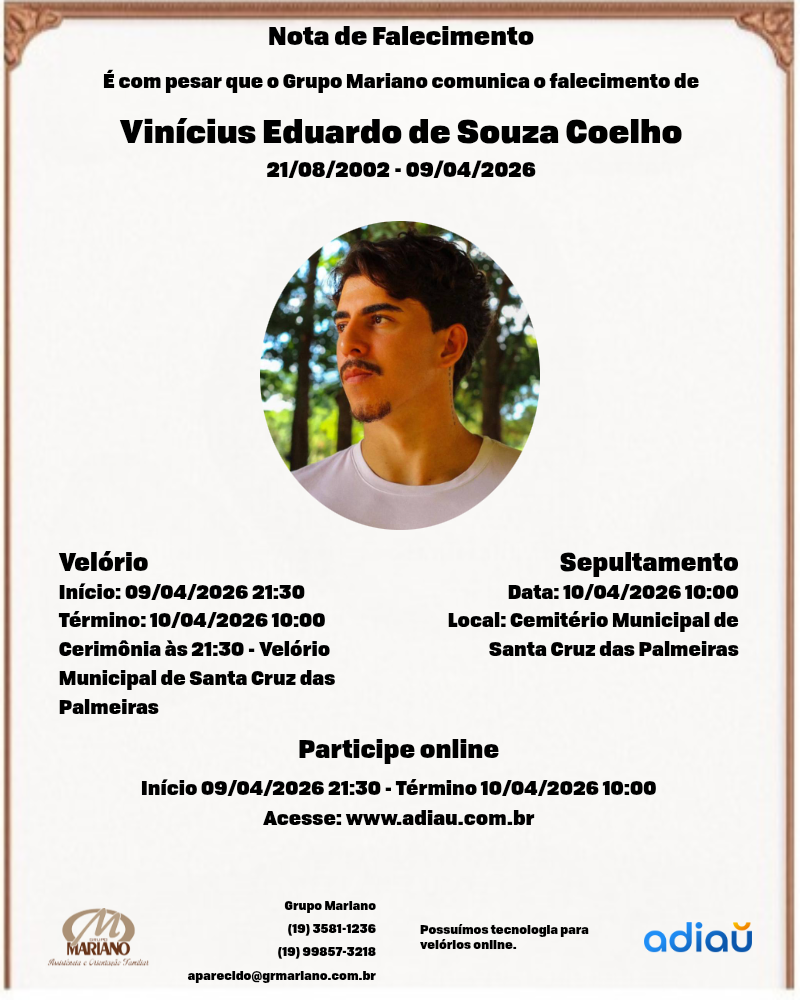 A Funerária Grupo Mariano (Santa Cruz), com profundo pesar, informa o falecimento de Vinícius Eduardo de Souza Coelho, aos 23 anos.